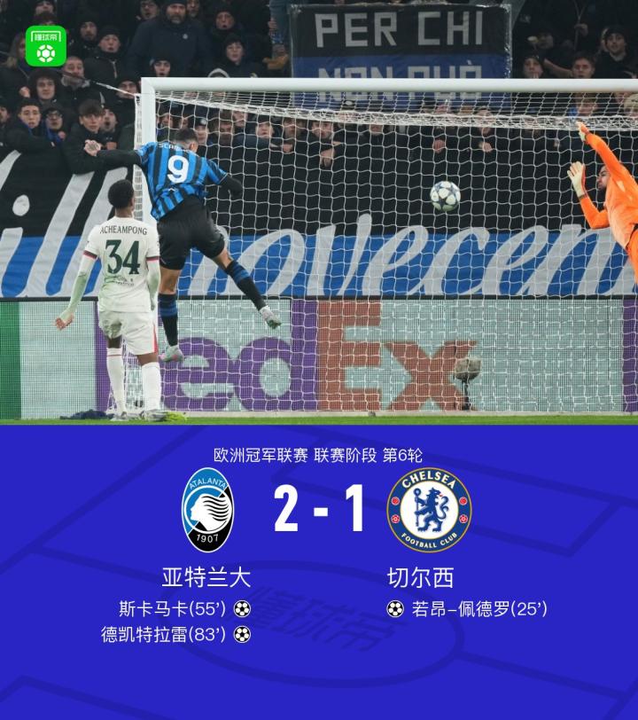 北京時間12月10號,歐洲冠軍聯賽聯賽階段第6輪開踢,亞特蘭大和切爾西碰上了。比賽一開始,切爾西就先聲奪人,若昂-佩德羅接到里斯-詹姆斯的助攻,一腳射門得分,讓球隊領先了。接著亞特蘭大開始反擊,德凱特拉雷傳了個好球,斯卡馬卡抓住機會,頭球一頂,把比分扳平了。下半場快結束的時候,亞特蘭大繼續施壓,德容恩又送了個關鍵球,德凱特拉雷冷靜射門得分,幫球隊反超了。最后,全場比賽結束,亞特蘭大2比1贏了切爾西。
