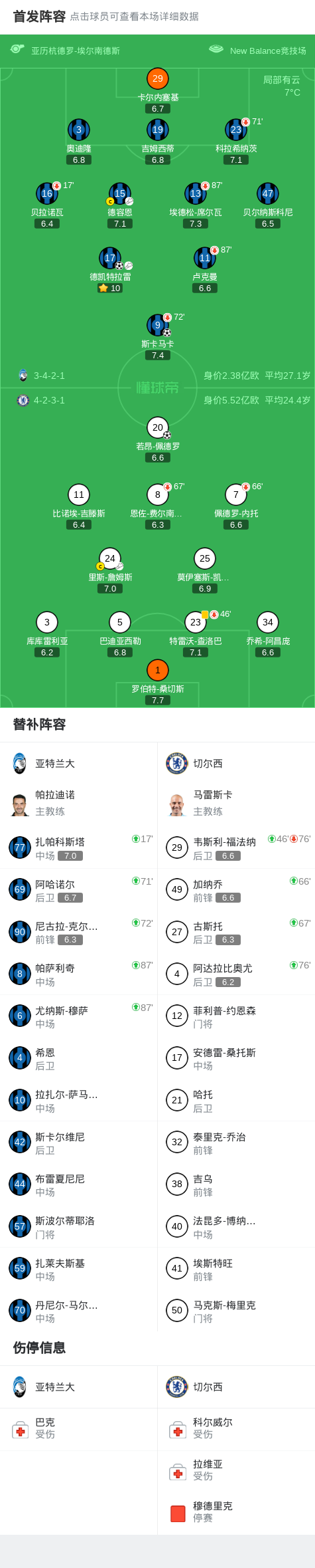 亞特蘭大2-1逆轉切爾西,德凱特拉雷傳射,斯卡馬卡建功